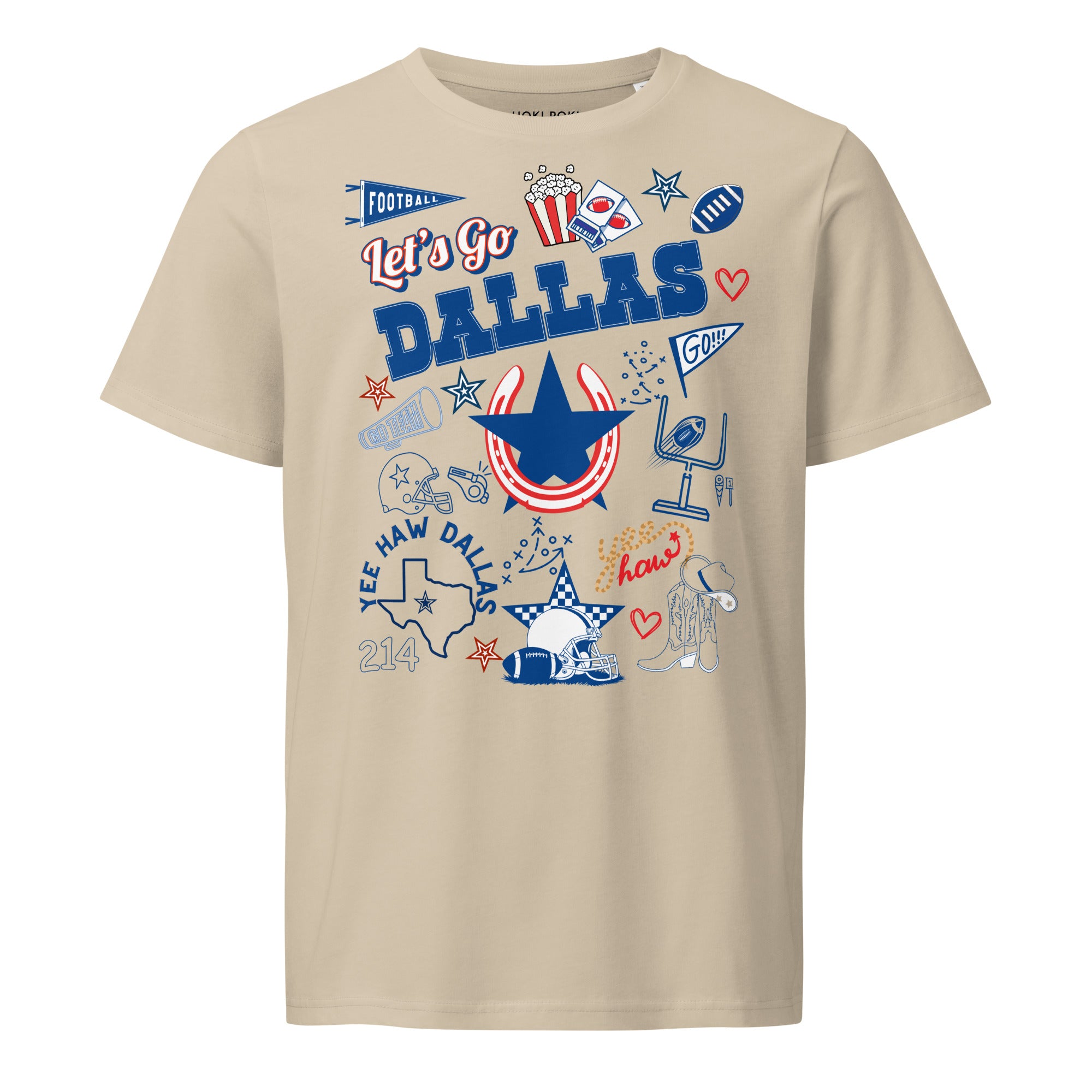 Turn every game day into a party with this Let’s Go Dallas tee! Packed with doodle-style graphics — cowboy boots, hats, popcorn, footballs, and the iconic 214 Dallas energy — this shirt is all about fun, fandom, and Texas pride.
